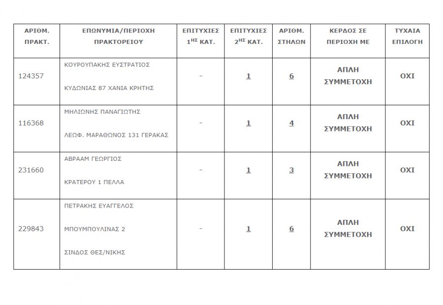 Στη δεύτερη κατηγορία βρέθηκαν τέσσερα τυχερά 5άρια, τα οποία κερδίζουν το ποσό των €27.241 έκαστο με ένα τυχερό 5αρι να πέφτει στην Κρήτη και συγκεκριμένα παίχτηκε στο πρακτορείο ΟΠΑΠ του κ.Κουρουπάκη στην οδό Κυδωνίας στα Χανιά.