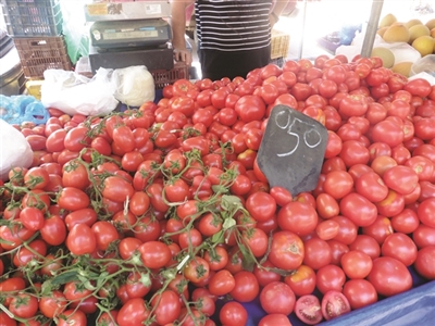 Με πικρία μας δείχνει τις ντομάτες πάνω στο πάγκο της. Γεμάτος με ντομάτες και τύπου, μάλιστα, Κουμουνδούρου, με κλωνάρι, και κόστιζε το κιλό μόλις 50 λεπτά. Τόσο χρειάστηκε να κατεβάσει την τιμή η κα. Μαρία, προκειμένου να ψωνίσει ο κόσμος.