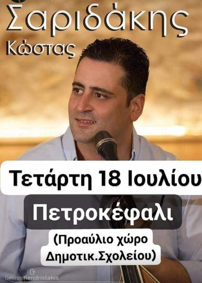 Σήμερα λοιπόν Τετάρτη 18 Ιουλίου, δίνουμε ραντεβού στον προαύλιο χώρο του δημοτικού σχολείου Πετροκεφαλίου για το μεγάλο φινάλε του 6ου Πανελλήνιου Φεστιβάλ Χορού που διοργάνωσε ο Μουσικοχορευτικός Σύλλογος Μεσαράς του Κωστή Γεωργιλαδάκη, με το συγκρότημα του Σαριδάκη Κωστή.