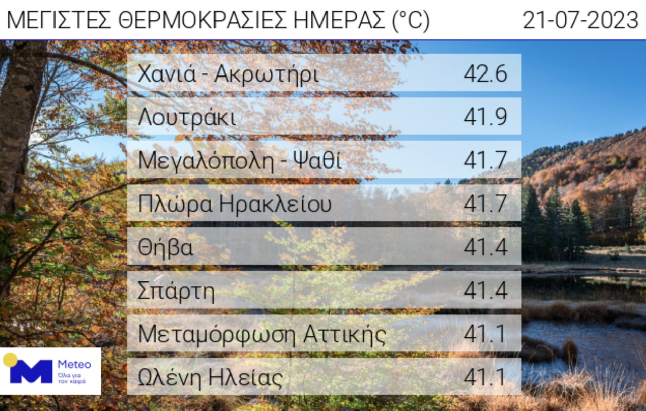 Οι 8 υψηλότερες τιμές θερμοκρασίας που κατέγραψαν οι σταθμοί του Εθνικού Αστεροσκοπείου Αθηνών/meteo.gr στο νησί δίνονται στον πίνακα που ακολουθεί, με τη μεγαλύτερη τιμή, 42.6 βαθμούς, στο Ακρωτήρι Χανίων.