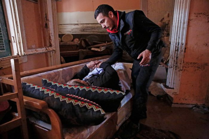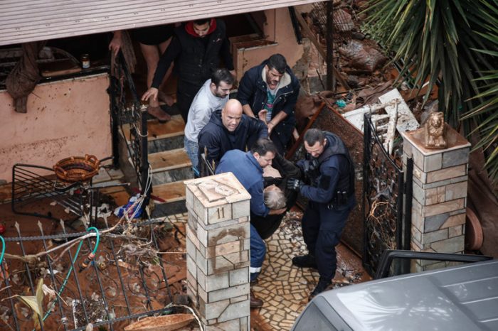 Συγκλονίζουν οι φωτογραφίες που δείχνουν τον απεγκλωβισμό ηλικιωμένης γυναίκας, η οποία βρίσκεται κατάκοιτη στο σπίτι της. Οι εικόνες προκαλούν σοκ. Το σπίτι της άτυχης γυναίκας έχει υποστεί καταστροφές από το πέρασμα των ορμητικών νερών και εκείνη βρίσκεται βρεγμένη και ανήμπορη πάνω στον καναπέ του σπιτιού της. Συγγενείς, γείτονες και άντρες της αστυνομίας μεταφέρουν την γυναίκα σε ασφαλές σημείο.