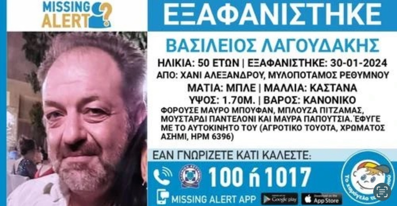 Ειδικότερα, ο Βασίλειος Λαγουδάκης εξαφανίστηκε από την περιοχή Χάνι Αλεξάνδρου στο Μυλοπόταμο Ρεθύμνου, στις 30 Οκτωβρίου. Ο 50χρονος έφυγε με το αυτοκίνητο του, αγροτικό μάρκας Toyota, χρώματος ασημί και αριθμό κυκλοφορίας HPM 6396, για να πάει στα κτήματα και έκτοτε τα ίχνη του αγνοούνται.