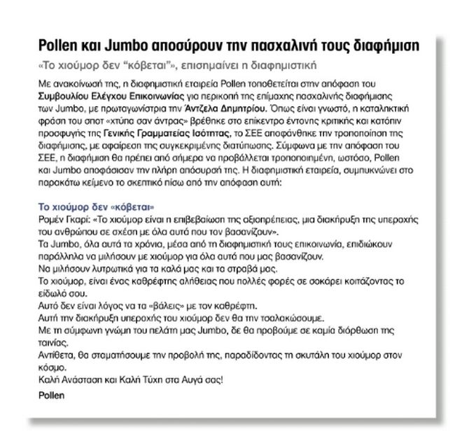 Με ανακοίνωσή της η διαφημιστική εταιρεία Pollen τοποθετήθηκε στην απόφαση του Συμβουλίου Ελέγχου Επικοινωνίας για περικοπή της διαφήμισης, με πρωταγωνίστρια την Άντζελα Δημητρίου