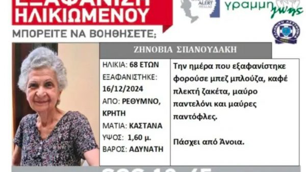Συναγερμός έχει σημάνει στις αστυνομικές αρχές στο Ρέθυμνο, μετά την εξαφάνιση της 68χρονης, Ζηνοβίας Σπανουδάκη, η οποία αγνοείται από την περασμένη Δευτέρα, 16 Δεκεμβρίου...