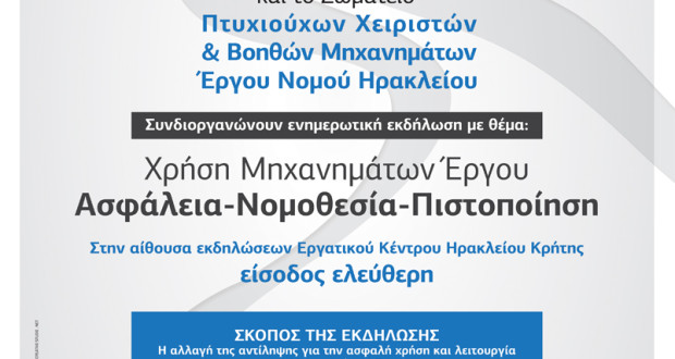 Ενημερωτική εκδήλωση με θέμα : «Χρήση Μηχανημάτων Έργου : Ασφάλεια, Νομοθεσία, Πιστοποίηση» συνδιοργανώνουν με τη στήριξη της Περιφέρειας Κρήτης, και του Οικονομικού Επιμελητηρίου Ελλάδος...