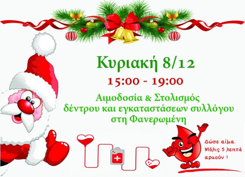 Μαζί με την φωταγώγηση θα γίνει και αιμοδοσία Την Κυριακή 8/12 στις 3 το μεσημέρι θα ξεκινήσει ο στολισμός του χριστουγεννιάτικου δέντρου αλλά και των...