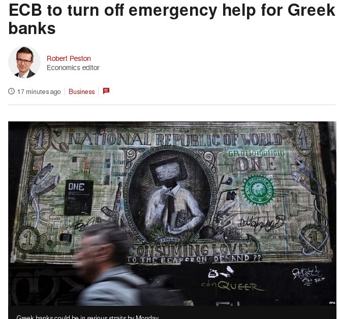 Η αναμενόμενη απόφαση της ΕΚΤ για τον τερματισμό του μηχανισμού έκτακτης ρευστότητας πηγάζει από τη χθεσινή απόφαση του Eurogroup που σημαίνει ότι δεν υπάρχει τρόπος να μην βγει η Ελλάδα από πρόγραμμα την Τρίτη και επίσης να μην πληρώσει τη δόση προς το ΔΝΤ την ίδια ημέρα, σημειώνει το βρετανικό δίκτυο.