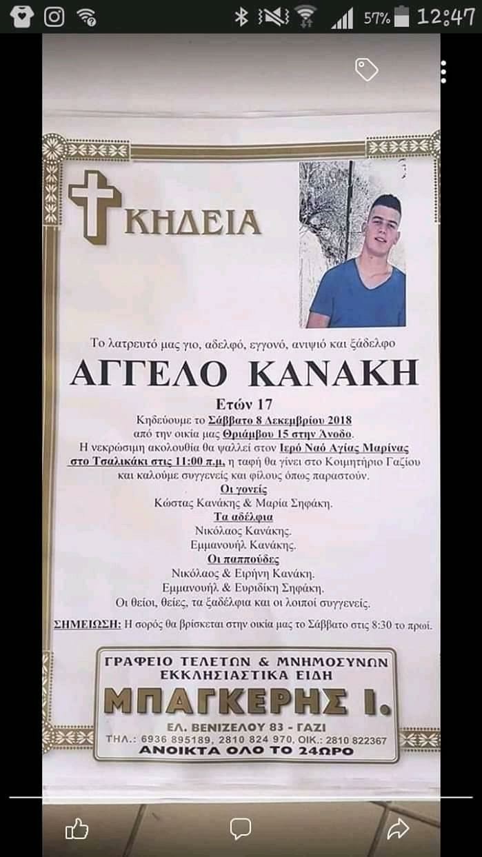 Στο Ηράκλειο σήμερα Παρασκευή 7–12–2018 και ώρα 11 π.μ. συνεδρίασε εκτάκτως ο Σύλλογος Διδασκόντων του 6ου ΕΠΑ.Λ. Ηρακλείου και αφού ενημερώθηκε από το διευθυντή κύριο Αρχοντάκη Κωσταντίνο για τον αδόκητο θάνατο του αγαπητού μαθητή του σχολείου μας Άγγελου Κανάκη αποφάσισε: