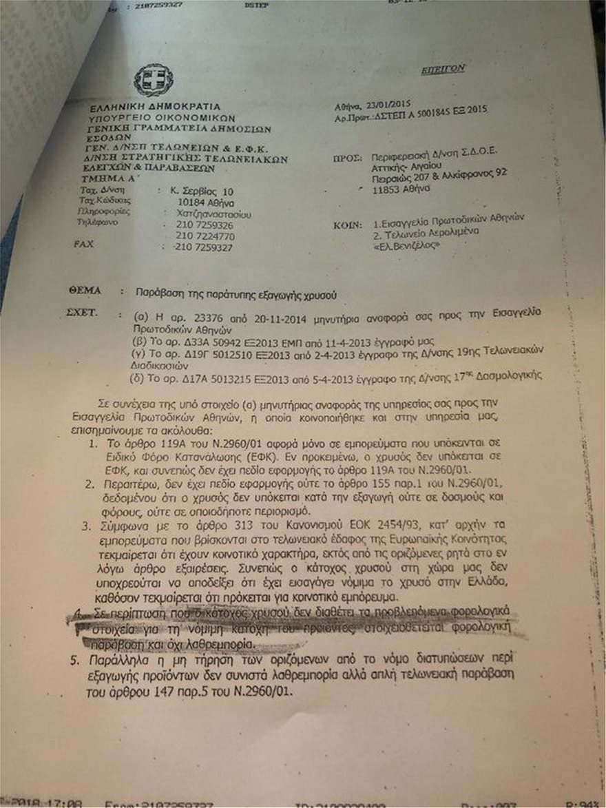 «Κατόπιν προφορικού αιτήματός μας την Τρίτη 3/12/2018 προς την ΑΑΔΕ Γενική Διεύθυνση Τελωνείων και ΕΦΚ Διεθνής Στρατηγικής Τελειωνειακών Ελέγχων και Παραβάσεων σχετικά με το ζήτημα αν οφείλονται δασμοί και φόροι κατά την εξαγωγή χρυσού προς τρίτη χώρα καθώς και αν η εν λόγω εξαγωγή στοιχειοθετεί λαθρεμπορία, διαβιβάστηκαν σε εμάς δύο εξερχόμενα έγγραφα της Διεύθυνσης Τελωνειακών Διαδικασιών και της Διεύθυνσης Δασμολογικών Θεμάτων αυθημερόν και περί ώρα 17:08 μέσω φαξ τα οποία απαντόν σχετικώς και σας προσκομίζω.