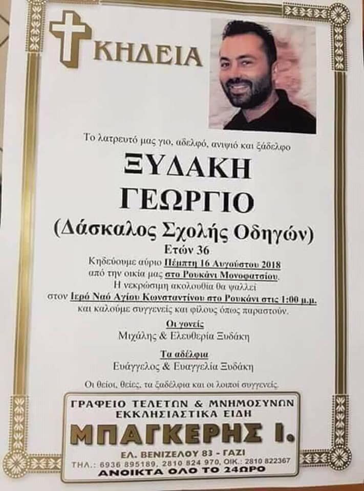 Θρήνος για τον 36χρονο Γιώργο Ξυδάκη, ιδιοκτήτη σχολής οδηγών στο Ηράκλειο, που έχασε χθες τη ζωή του σε τροχαίο, στον κόμβο του αεροδρομίου Ηρακλείου.