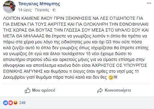 Με ανάρτησή του στο facebook ο Χαράλαμπος Τσαγαλάς απευθυνόμενος στον υπουργό Άμυνας αναφέρει: «Θα βουτάς τη γλώσσα σου μέσα στο μυαλό σου και μετά θα μιλάς». Ο Χαράλαμπος Τσαγαλάς ο οποίος είχε μιλήσει και πριν δύο ημέρες για την απόφαση των τριών νεαρών να υψώσουν τη σημαία στη βραχονησίδα, επανήλθε λέγοντας ότι «εγώ και άλλοι 15 νέοι έχουμε δώσει το απολυτήριο στρατού εδώ και αρκετούς μήνες για είμαστε επίσημα στην εθνοφυλακή και αποτέλεσμα κανένα…».
