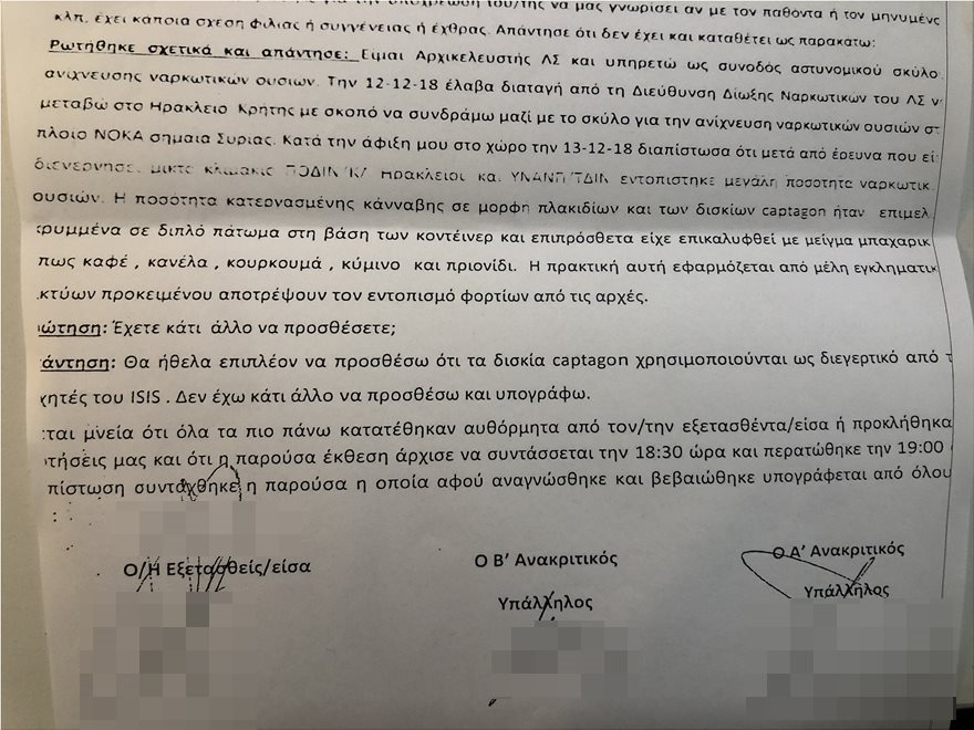 Αναφορά στο περιεχόμενο των κοντέινερ με τους έξι τόνους “σοκολάτας”και τα χάπια των τζιχαντιστών κάνει στην κατάθεση του αρχικελευστής του Λ.Σ που στις 12 Δεκεμβρίου κλήθηκε με αστυνομικό σκύλο να μεταβεί στο Ηράκλειο της Κρήτης για να συνδράμει στην ανίχνευση των ουσιών. “Από την έρευνα διαπίστωσα ότι η ποσότητα κατεργασμένης κάνναβης σε μορφή πλακιδίων και των δισκίων captagon ήταν επιμελώς κρυμμένα σε διπλό πάτωμα στη βάση των κοντέινερ και επιπρόσθετα είχε επικαλυφθεί με μείγμα μπαχαρικών όπως καφέ, κανέλα, κουρκουμά, κύμινο και πριονίδι. Η πρακτική αυτή εφαρμόζεται από μέλη εγκληματικών δικτύων προκειμένου να αποτρέπουν τον εντοπισμό των φορτίων από τις αρχές” είπε ενώ ερωτηθείς αν έχει να προσθέσει κάτι άλλο είπε ότι “Θα ήθελα επιπλέον να πρ0σθέσω ότι τα δισκία captagon χρησιμοποιούνται ως διεγερτικό από τους μαχητές του ISIS”.