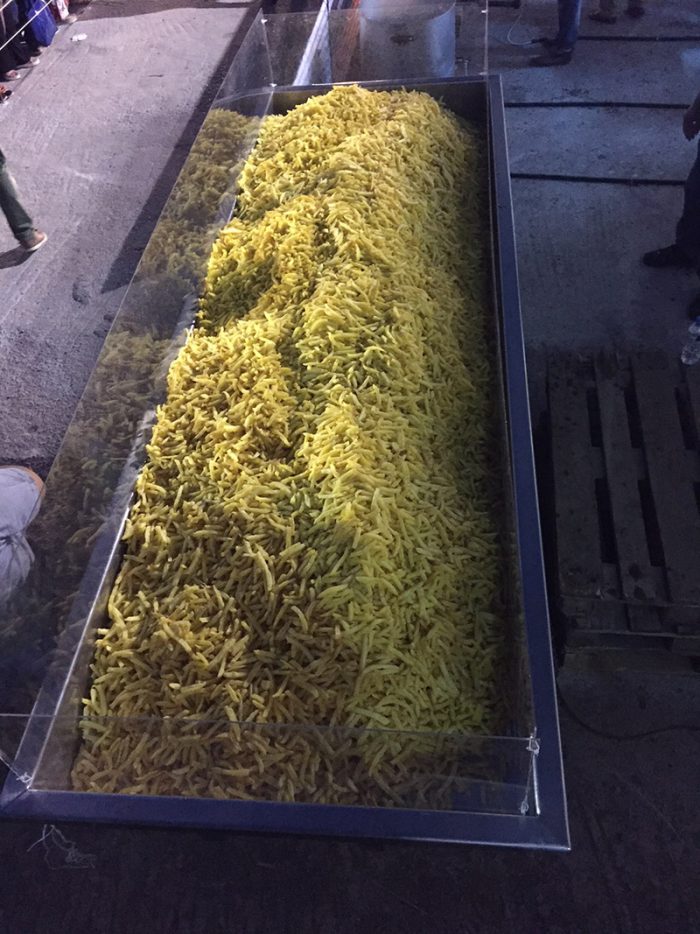 Το βάρος των ακαθάριστων και ακατέργαστων πατατών ήταν 569.71 κιλά kg και το λάδι που χρησιμοποιήθηκε για το τηγάνισμά τους ήταν 500.07 λίτρα.