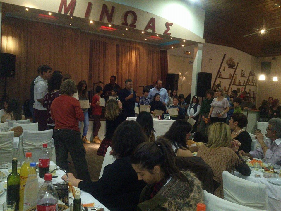 Το “πρόγραμμα’ είχε απ όλα!!!Η βραδιά ξεκίνησε με τις βραβεύσεις των αθλητών του σωματείου..Καλύτερη αθλήτρια για το 2014 βραβεύτηκε η Πεδιαδιτάκη Μαρινέλα (2η Πανελληνιονίκης στο ξίφος ασκήσεως).Καλύτερη ομάδα η ομάδα του ξίφους μονομαχίας εφήβων με τους Πατσιανωτάκη Λάμπη,Φουστανάκη Στέλιο και Τσακιράκη Θοδωρή.Βραβεύτηκαν όμως όπως κάθε χρονιά και οι καλύτεροι μαθητες της χρονιας που πέρασε με τους Πατσιανωτακη Λάμπη και Γρηγοριάδη Παύλο να παίρνουν τον έπαινο του καλύτερο μαθητή Γυμνασιου-Λυκείου και Δημοτικού αντίστοιχα.Επίσης βραβεύτηκαν και όλοι οι αθλητές που πήραν μετάλλια στους Περιφερειακούς-Αναπτυξιακούς αγώνες Κρήτης και Αθηνών.
