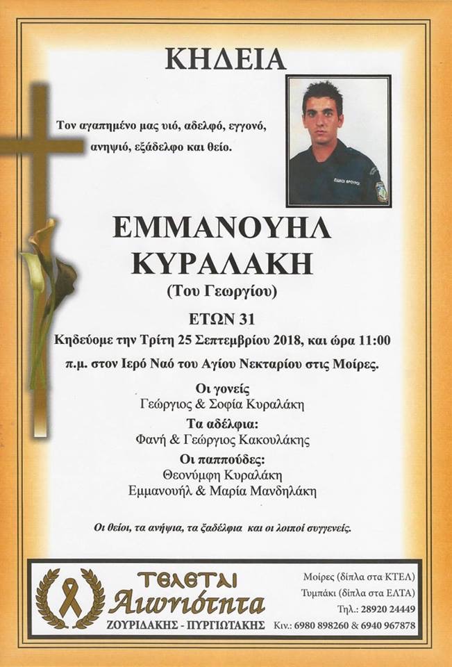 Αυριο Τρίτη και ώρα 11 το πρωί, στον Ιερό Ναό Αγίου Νεκταρίου στις Μοίρες, θα πραγματοποιηθεί η κηδεία του Μανώλη Κυραλάκη.