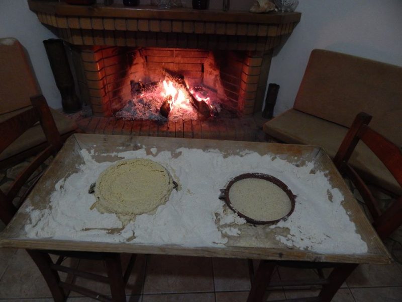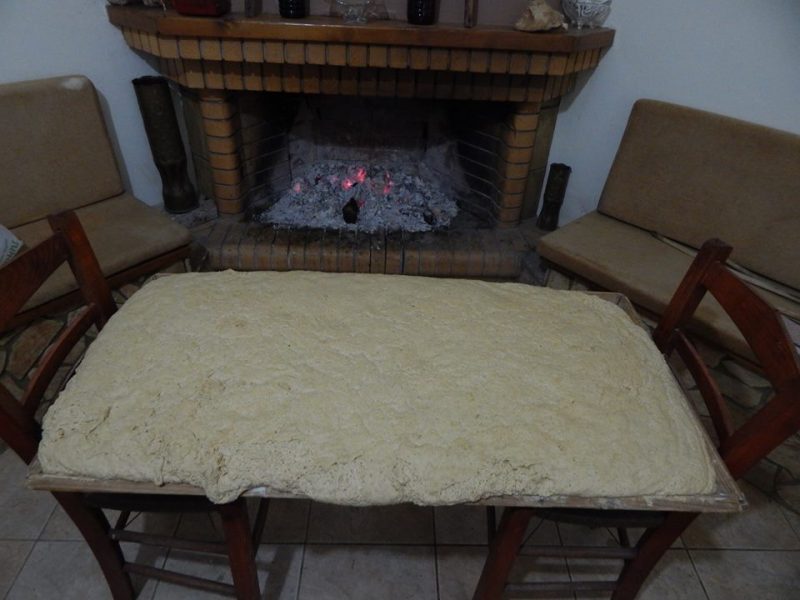 Μετά τη πλάθομε και τη βάνομε στσι πινακοτές απάνω, αφού κουκίσομε σε αυτές μια ουλιά αλεύρι, ενώ σκεπάζομε με τη κουβέρτα, τσι πινακοτές.