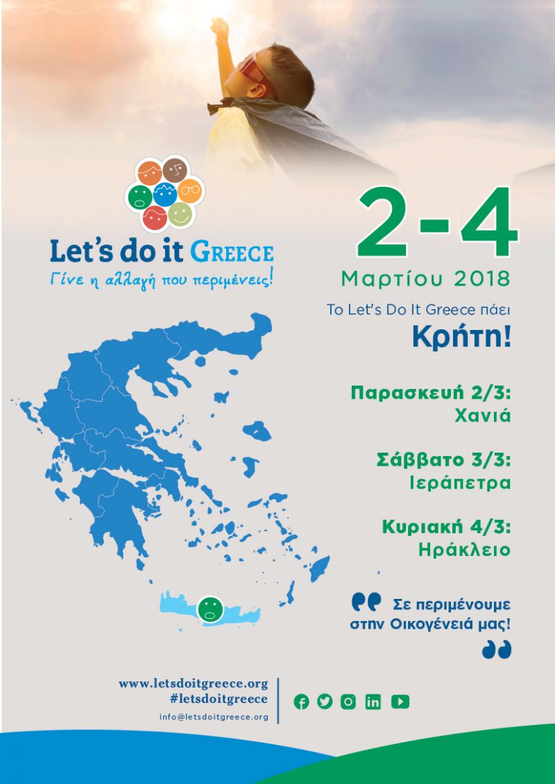 Αυτή την Κυριακή (04/03), το Let’s do it Greece έρχεται στην πόλη του Ηρακλείου για να οργανώσει τους εθελοντές της πόλης για την μεγαλύτερη, ταυτόχρονη, εθελοντική δράση της χώρας που θα πραγματοποιήθει στις 29 Απρίλη.