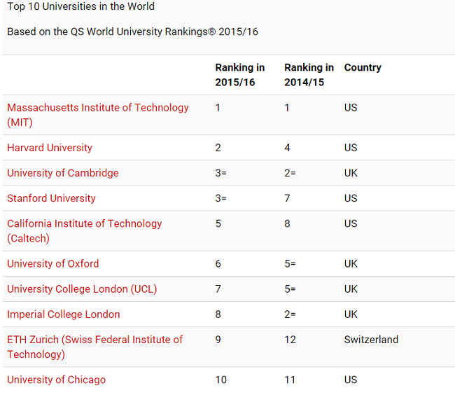 Όσον αφορά τις πρώτες δέκα θέσεις συναντάμε για ακόμη μια χρονιά τριτοβάθμια ιδρύματα των ΗΠΑ και του Ηνωμένου Βασιλείου, στις 9 από τις 10 θέσεις, ενώ φέτος στην πρώτη δεκάδα βρίσκουμε και το ΕΤΗ Zurich. Κορυφαίο πανεπιστήμιο του κόσμου και για το 2015-2016 αναδεικνύεται το ΜΙΤ.