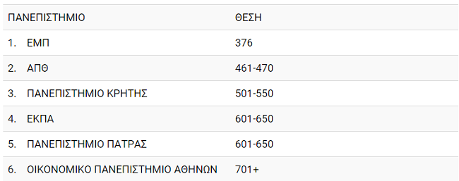 Από τα υπόλοιπα πανεπιστήμια, το Αριστοτέλειο το συναντάμε στις θέσεις 461-470 και το Πανεπιστήμιο Κρήτης 501-550. Λίγο πιο πίσω και συγκεκριμένα στις θέσεις 601-650 βρίσκονται Καποδιστριακό και Πανεπιστήμιο Πάτρας ενώ η έκτη ελληνική παρουσία, το Οικονομικό Πανεπιστήμιο Αθηνών βρίσκεται για τρίτη συνεχή χρονιά στη θέση 701+.