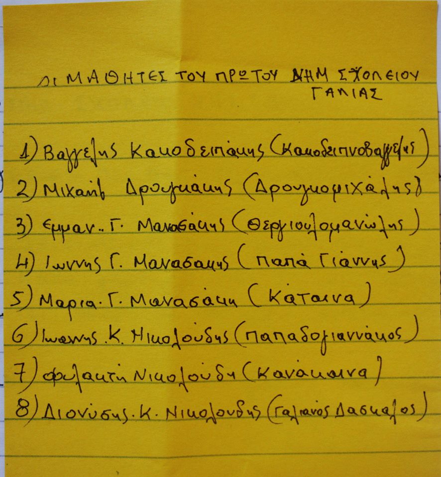 -Να ξέρεις του λέει, πως αυτό το σπίτι που πήρες σήμερα, ήταν το πρώτο μας δημοτικό της Γαλιάς! Και επί τη ευκαιρία, να σου πω διό λόγια που κατέχω. Τα κατέχω καλά, γιατί επαδά που θωρείς, ήμαθα γράμματα και εγώ μια φορά και ένα καιρό! Ούλη κι ούλη ήταν μια αίθουσα, και ήμαστε 8 μαθητές ούλοι κι ούλοι! Δάσκαλο είχαμε το Νικολόπαπα από τα Βορίζα! |-Ε αφού «διάβαζες» σε αυτό το σχολειό, μήπως θυμάσαι μπάρμπα Βαγγέλη και πχοί ήτανε οι άλλοι εφτά μαθητές?