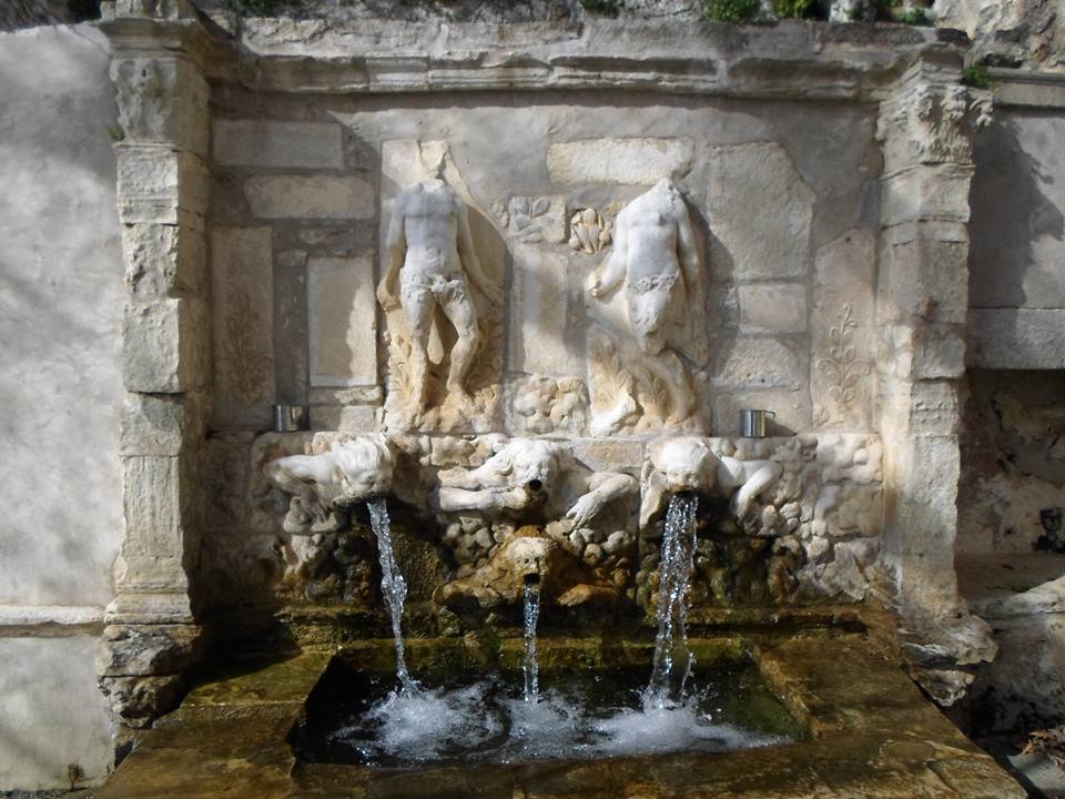 Στη μαρμάρινη βρύση παριστάνονται σε ανάγλυφο μορφή, κατά μια εκδοχή, οι Πρωτόπλαστοι στον επίγειο Παράδεισο, και τέσσερις μορφές που συμβολίζουν τους ποταμούς της Εδέμ, που είναι: ο Φισών, ο Γεών, ο Τίγρης και ο Ευράτης, ενώ κατά μία δεύτερη εκδοχή παριστάνονται, οι πρωτόπλαστοι στον επίγειο Παράδεισο, ενώ οι τέσσερις μορφές παριστάνουν τους τέσσερις Ευαγγελιστές, καθ’ όσον όπως έτρεχαν τα καλά λόγια από το στόμα των, τρέχει και το γάργαρο νερό.