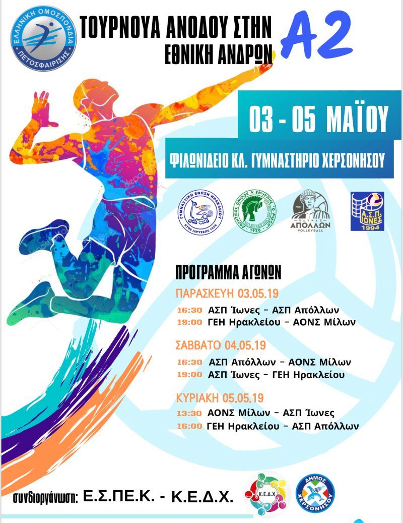 Η Κοινωφελής Επιχείρηση Δήμου Χερσονήσου (ΚΕΔΧ), η Ελληνική Ομοσπονδία Ποδοσφαίρισης (Ε.Ο.ΠΕ.) και η Ένωση Σωματείων Πετοσφαίρισης Κρήτης (ΕΣΠΕΚ) διοργανώνουν το Τουρνουά Ανόδου στην Α2 Εθνική κατηγορία Ανδρών Βόλεϊ.