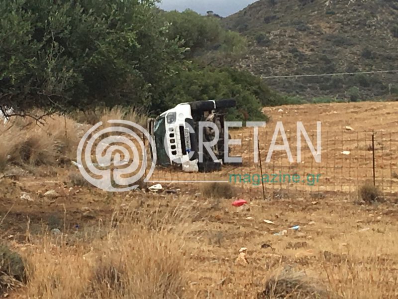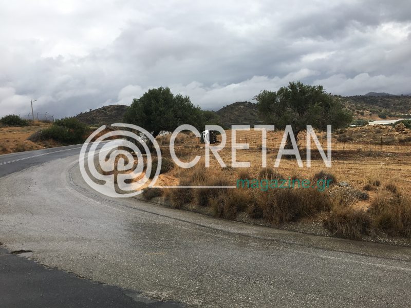 Το ίδιο έπαθε και το αυτοκίνητο που βλέπετε στις φωτογραφίες, το οποίο έξω από το Τυμπάκι προς την Αγία Γαλήνη, γλίστρησε και βρέθηκε τούμπα μέσα στο χωράφι.