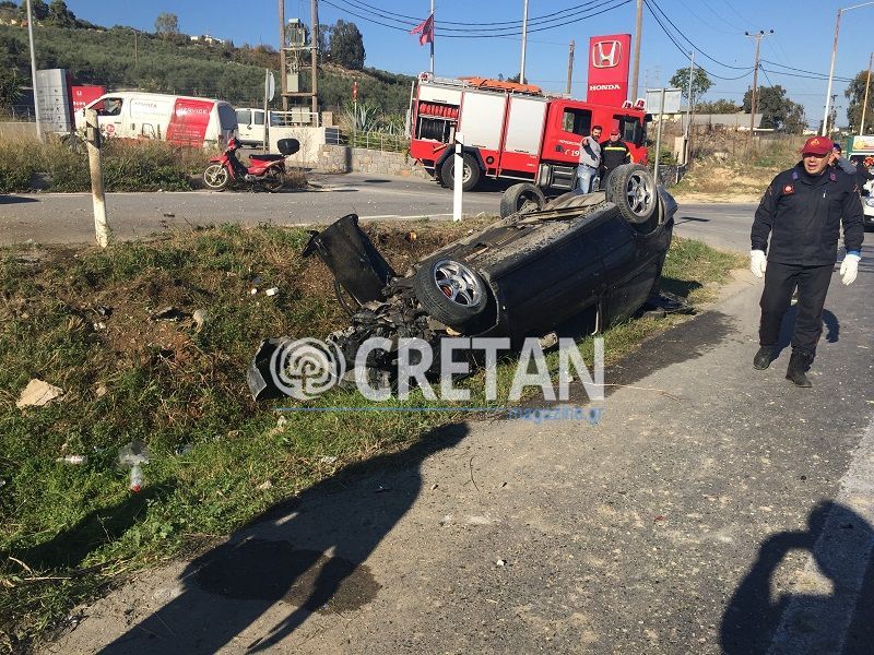 Σήμερα το μεσημέρι ένα αυτοκίνητο στο οποίο επέβαινε ένα ζευγάρι ξέφυγε από την πορεία του στο 5ο χλμ της εθνικής οδού Ηρακλείου – Μοιρών και ανετράπη στο αντίθετο ρεύμα της κυκλοφορίας.