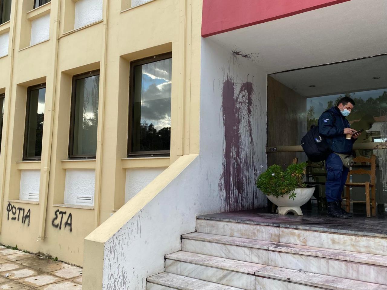 Επίθεση σημειώθηκε τα ξημερώματα στο Δικαστικό Μέγαρο Ρεθύμνου από αγνώστους, οι οποίοι έγραψαν συνθήματα, πέταξαν μπογιές και έσπασαν τμήμα της γυάλινης πόρτας εισόδου.