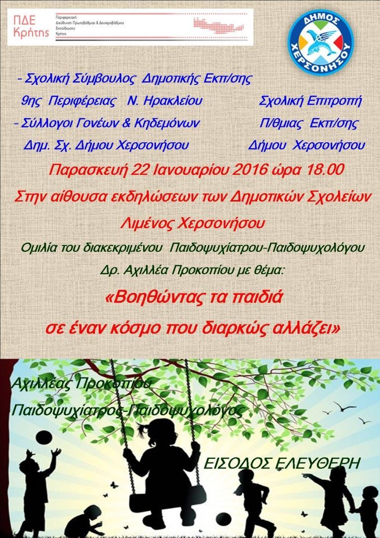 Η Σχολική Επιτροπή Πρωτοβάθμιας Εκπαίδευσης Δήμου Χερσονήσου, οι Σύλλογοι Γονέων και Κηδεμόνων Δημοτικών Σχολείων Δήμου Χερσονήσου και η σχολική Σύμβουλος Δημοτικής Εκπαίδευσης 9ης Περιφέρειας νομού Ηρακλείου διοργανώνουν σήμερα, στις 6 το απόγευμα, στην αίθουσα εκδηλώσεων των Δημοτικών Σχολείων Λιμένα Χερσονήσου ομιλία με θέμα: «Βοηθώντας τα παιδιά σε έναν κόσμο που διαρκώς αλλάζει».