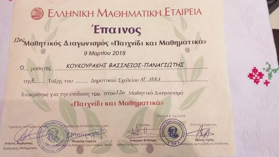 Την εξαίρετη επίδοση μαθητών του Σχολείου των Αγίων Δέκα βράβευσε η Ελληνική Μαθηματική Εταιρεία στο πλαίσιο της συμμετοχής τους στον 12ο Πανελλήνιο Μαθητικό Διαγωνισμό στα Μαθηματικά «Παιχνίδι και Μαθηματικά» που πραγματοποιήθηκε στις 9 Μαρτίου 2018.