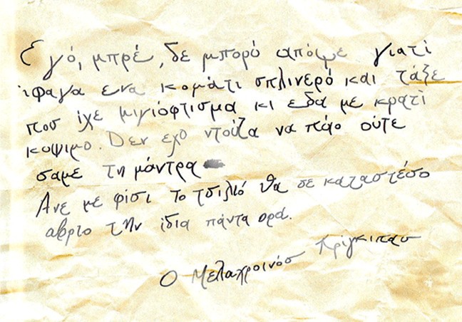 Και ενώ όλοι έχουμε στο μυαλό μας το πόσο ρομαντική θα ήταν αυτού του είδους η επικοινωνία, το ραβασάκι μιας Κρητικιάς με το ψευδώνυμο “Το πανέμορφο αγριολούλουδο” στον αγαπητικό της και η απάντηση εκείνου με το ψευδώνυμο “Ο μελαχροινός Πρίγκηπας”, μας προσγειώνει απότομα και μας κάνει αν μη τι άλλο να γελάσουμε.