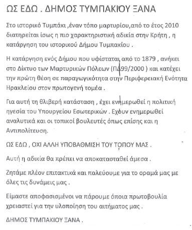 Με ανακοίνωση τους Σύλλογοι από το Τυμπάκι φέρνουν στην επικαιρότητα ξανά το θέμα της ανεξαρτητοποίησης του, ζητώντας να δημιουργηθεί και πάλι ξεχωριστός Δήμος.